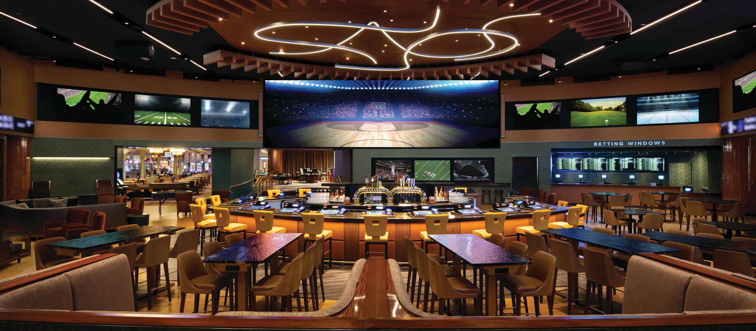 The BetMGM Race & Sportsbook features 100 seats with individual monitors, 40 individual betting machines, 10 betting windows, kiosks exclusively for placing horse racing bets, and an enormous video wall with screens to follow the action from around the world. The BetMGM Race & Sportsbook offers a 100 percent smoke-free environment.